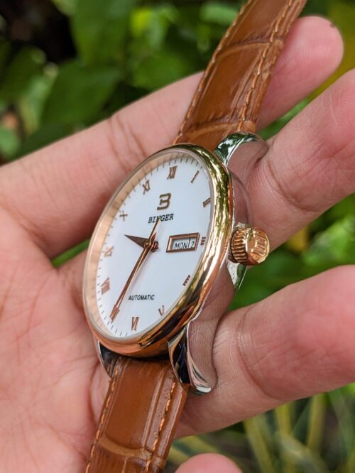 A true blend of classic elegance and mechanical precision. Featuring a crisp white dial with Roman numerals, rose gold detailing, and a day-date display – all powered by a reliable automatic movement.